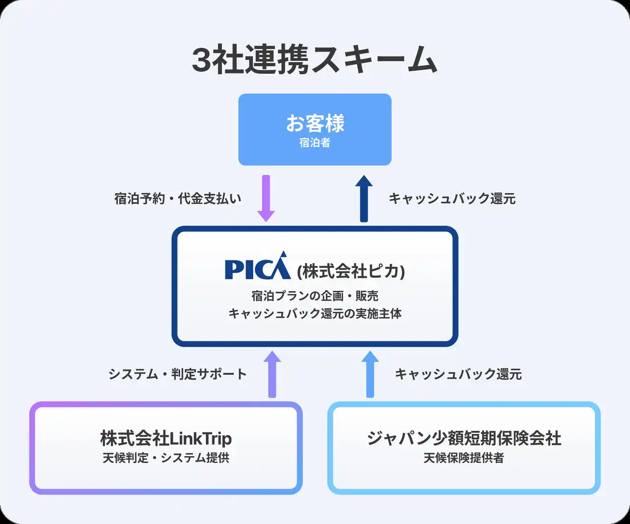 今回のPICAとの連携は、アウトドア宿泊施設への本格展開の第一号事例です。キャンプ・グランピングは「天気が全ての体験を左右する」業態であり、天候連動キャッシュバックの導入メリットが最大化される領域です。ピカが持つ国内トップクラスのアウトドアリゾート運営力と、LinkTripの独自システム、ジャパン少額短期保険の保険引受力を組み合わせることで、アウトドア業界に先駆けた新しい顧客体験モデルを構築します。 |