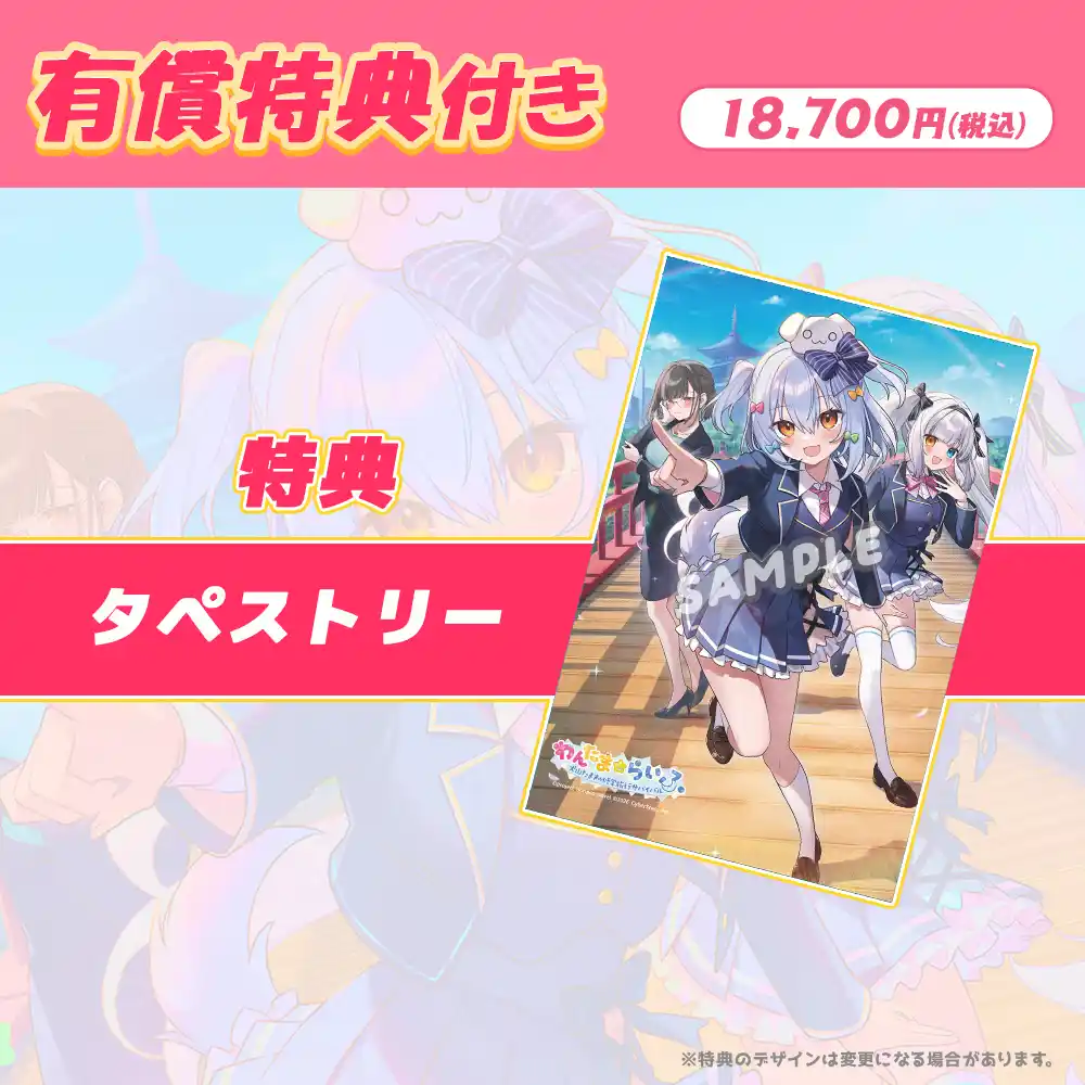 | さらに、スペシャルボックスのパッケージ内容に加え、B2サイズの大型タペストリーがついてくる「有償特典付きスペシャルボックス(税込18,700円)」も用意していますので、ぜひこの機会に予約ページをご確認くださいね。 | ||||||||||||||||