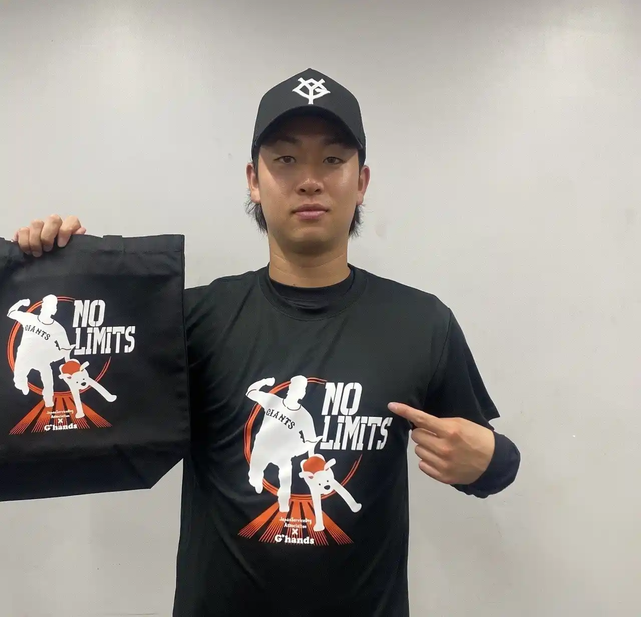 2026シーズンのGIANTSチームスローガン「前進 ~GIANTS CHALLENGE~」に合わせて前に進んでいる勢いのあるイラストと、限界はない(=前に進み続ける)という意味の「NO LIMITS」が描かれたデザインの商品。今シーズンはTシャツだけではなく、トートバッグも展開。 |
