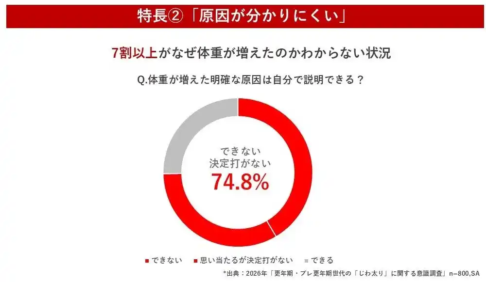 調査では67.5%が「若い頃と同じ生活をしていても太る」と回答する中、その体形変化の特徴として、「変化のスピードが遅い」、「原因がわかりにくい」、「生活環境は変わっていない」という3つの観点が明らかになりました。当社ではこの「自覚できるきっかけがないまま、生活を大きく変えていないのに、少しずつ体重や体型が変化していく現象」を「じわ太り」と定義しました。そして調査の結果からは、「体重増加に影響する大きな生活変化はない」と回答した更年期・プレ更年期世代の約8割*が、この「じわ太り」を経験しているということが判明しました。 |