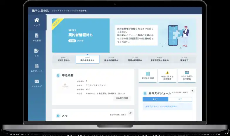 不動産管理会社様の手間とコストを削減し、入居申込から審査までオンラインで完結できる入居申込システムです。 |