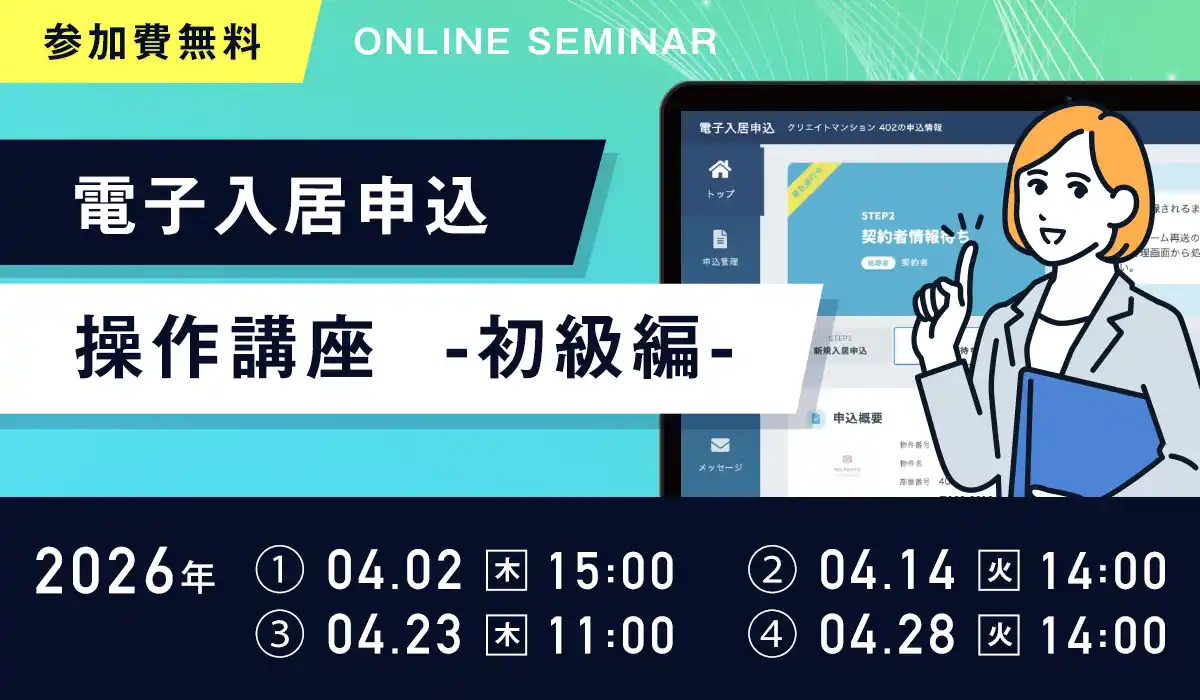 不動産テックを推進する日本情報クリエイト株式会社(本社:宮崎県都城市、代表取締役社長:辻村 都雄、証券コード:4054)は、電子入居申込をご利用中の不動産会社様を対象に、「電子入居申込 操作講座(初級編)」と題した無料オンラインセミナー(以下、ウェビナー)を2026年4月に開催いたします。 |