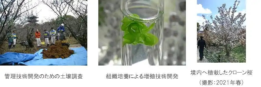 本プロジェクトのもと、住友林業は社内研究施設である筑波研究所で御室桜の生態解明と科学的知見に基づく管理技術の研究を実施。研究の末、2010年に御室桜の組織培養増殖に成功しました。2012年に境内へ植栽したクローン桜は、2014年にはじめて開花し、以降美しい花を咲かせています。 |
