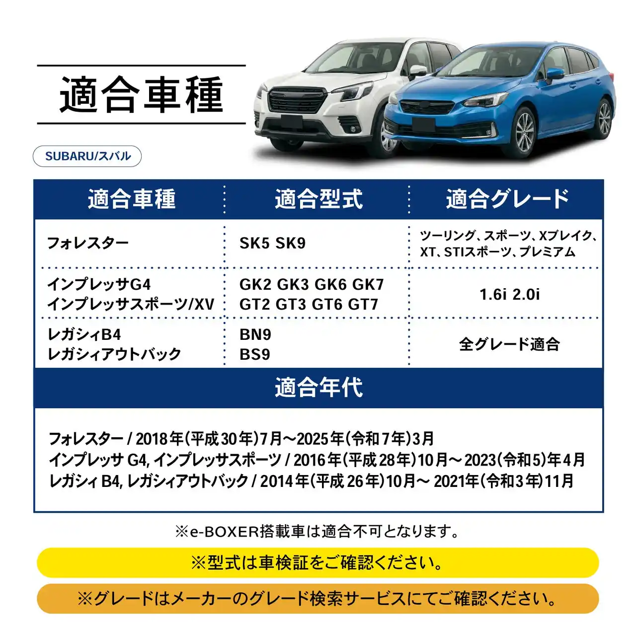 [適合車種・適合型式・適合グレード] SUBARU/スバル ○フォレスター SK5 SK9 ツーリング、スポーツ、Xブレイク、XT、STIスポーツ、プレミアム ○インプレッサG4 インプレッサスポーツ/XV GK2 GK3 GK6 GK7 GT2 GT3 GT6 GT7 1.6i 2.0i ○レガシィB4 レガシィアウトバック BN9 BS9 全グレード適合 [適合年式] フォレスター / 2018年(平成30年)7月~2025年(令和7年)3月 インプレッサ G4,インプレッサスポーツ / 2016年(平成28年)10月~2023(令和5)年4月 レガシィB4,レガシィアウトバック / 2014年(平成26年)10月~2021年(令和3年)11月 ※e-BOXER搭載車は適合不可となります。 |
