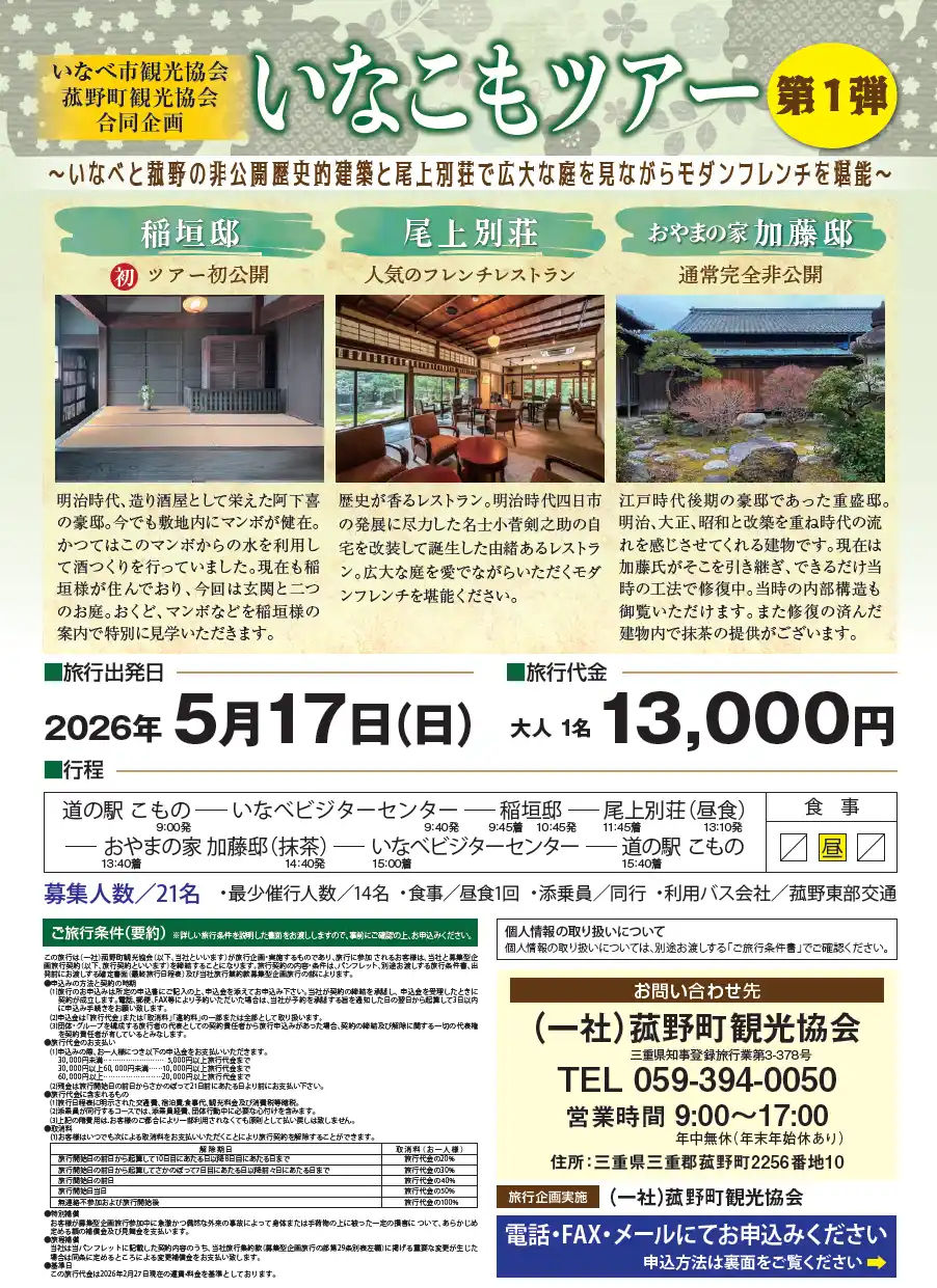 行程: 道の駅こもの(9:00発) = いなべビジターセンター = 稲垣邸 = 尾上別荘(昼食) = おやまの家 加藤邸(抹茶) = 道の駅こもの(15:40着予定) |