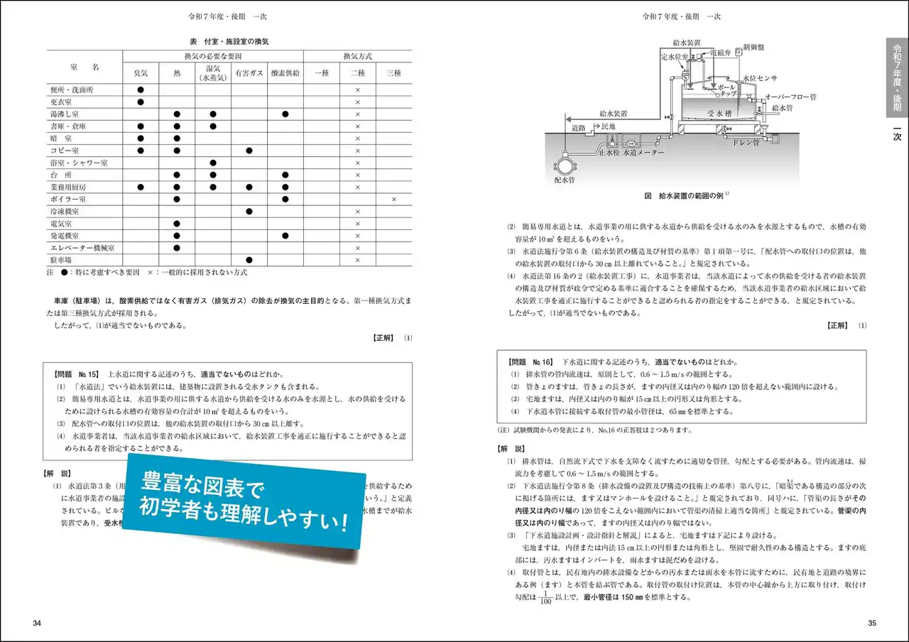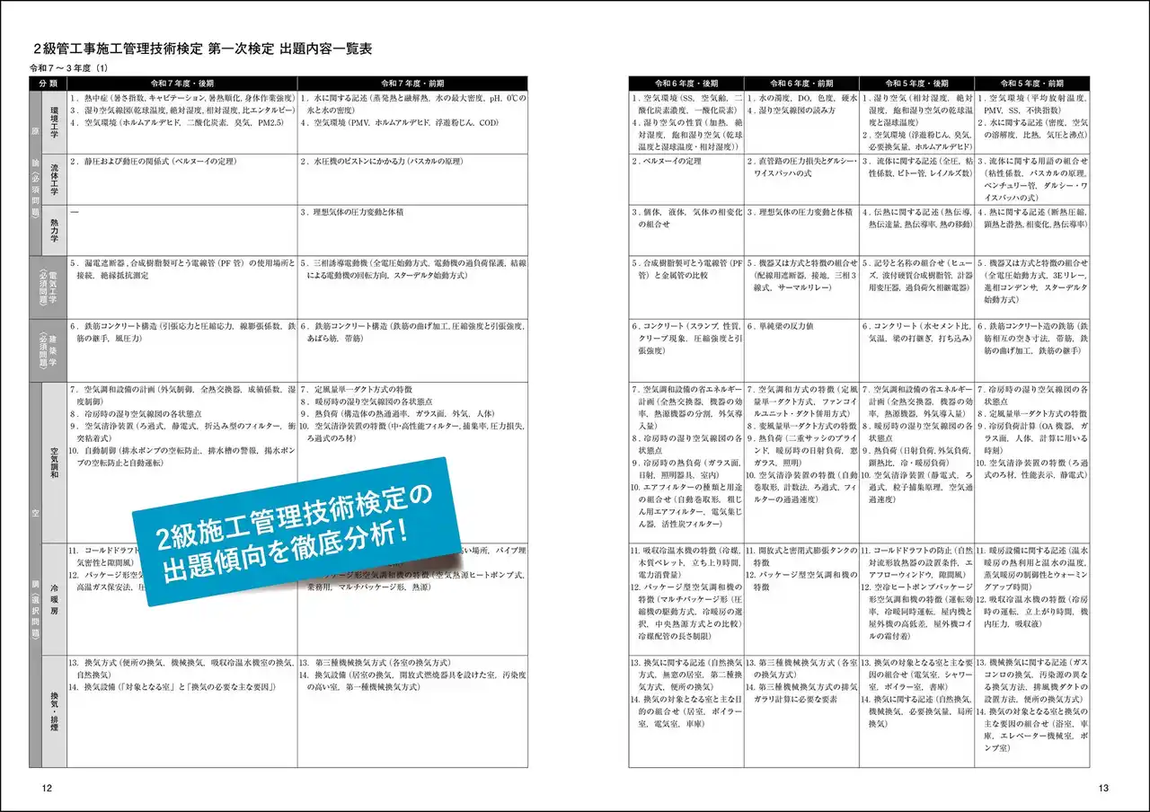 また、2級管工事施工管理技術検定では、過去に出題された問題と類似の問題が出題されたり、正答肢を入れ替えて再度出題されたりするケースがよくあります。本書では過去の出題内容を一覧にまとめていますので、出題傾向を把握し、苦手な分野などを徹底的に対策することが効果的です。 |