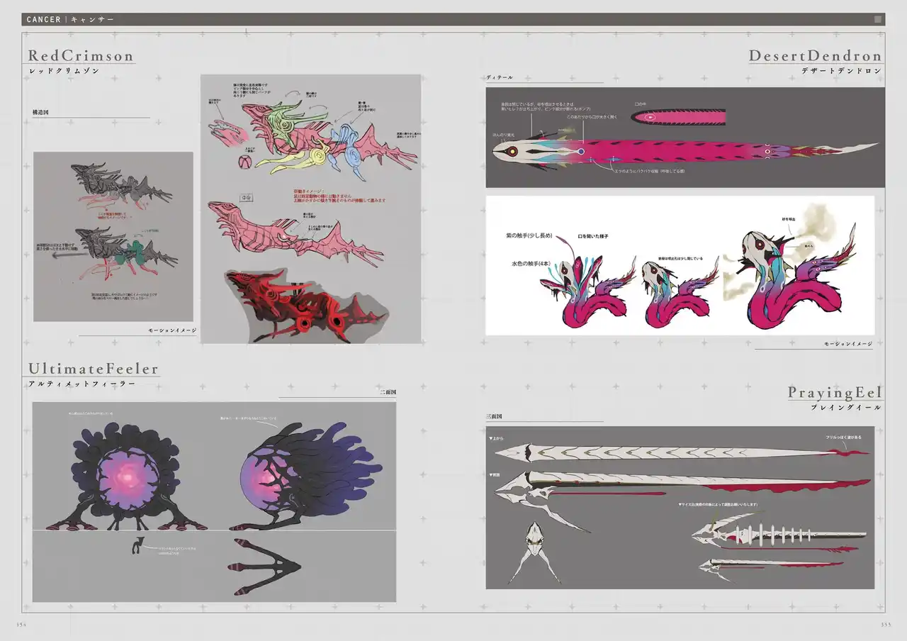 書初公開となる、ボスキャンサーの設定画を掲載。初期イメージや攻撃モーションを確認できます。 |