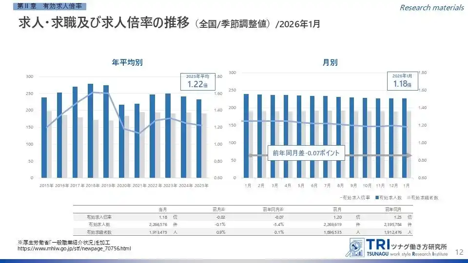 RPO(採用業務代行)・採用コンサルティングを行う株式会社ツナググループ・ホールディングス(本社:東京都中央区、代表取締役兼執行役員社長:米田 光宏)を母体とする、多様な働き方の調査研究機関「ツナグ働き方研究所(拠点:東京都中央区、所長:大野 博司)」は、官公庁などが発表する労働市場関連のデータをキュレーションしつつ、分かりやすくまとめた「労働市場データレポート」を毎月発表しています。今回は3月上旬に発表された最新データをもとに、2026年1月度のレポートについて、とりまとめましたのでご報告いたします。 |