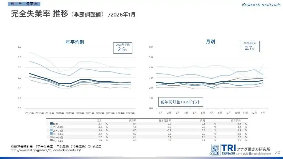 2026年1月の完全失業率(季節調整値)は2.7%となり、前月差0.1ポイント、前年同月差では0.2ポイント増加しています。年齢階級別では、25~34歳(-0.1ポイント)のみが、前年同月差で減少しました。完全失業者数は179万人で、前年同月差では16万人の増加となりました。 |