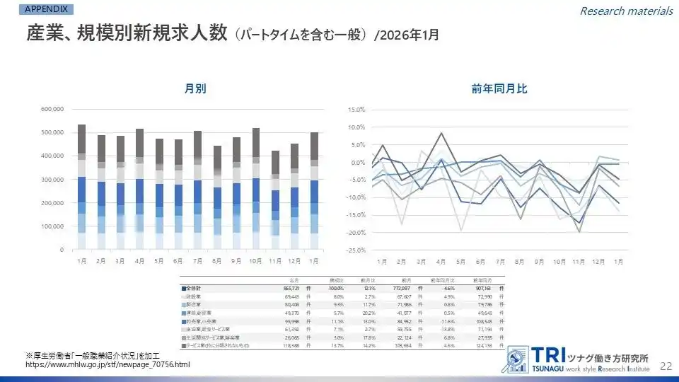 2026年1月の新規求人数は、前年同月比で4.6%減少となり、9か月連続で前年同月を下回る結果となりました。産業別の伸び率では教育,学習支援業(+4.3%)、製造業(+0.8%)、学術研究,専門・技術サービス業(+0.3%)で増加となり、宿泊業,飲食サービス業(-13.8%)、卸売業,小売業(-11.6%)、情報通信業(-7.0%)などで減少となりました。 |