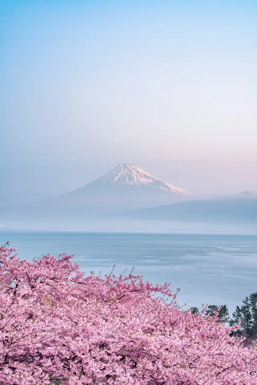 冷たい朝の空気の中、凛とそびえる富士山と、それを包み込むように咲き誇る桜。 |