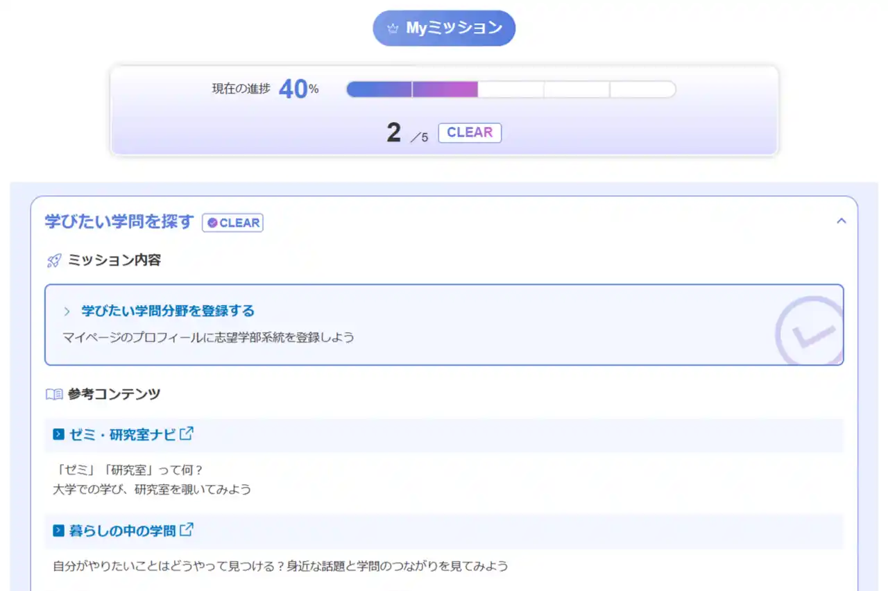 Myミッションはこれから志望校を検討する主に高1・2生を対象とした低学年向けのコンテンツです。 「何を学びたいか」「どんな大学があるのか」「入試の仕組みはどうなのか」といった志望校選択のプロセスをミッション形式で順を追って進められるツールです。 |