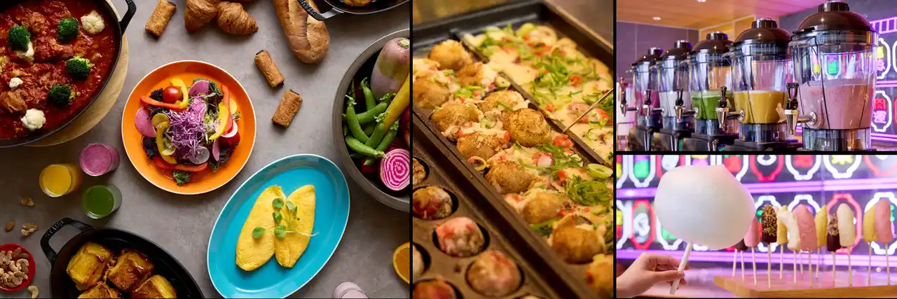 「カーニバルキッチン」をコンセプトに、大阪らしいユーモア溢れるビュッフェをご用意。和洋の王道メニューに加え、オープンキッチンを使った“洋風たこ焼き”などの定番大阪アレンジ料理、フレッシュフルーツやミックスジュース、綿あめ・チョコバナナなどお祭りをイメージしたラインアップが一日の始まりを彩ります。 |