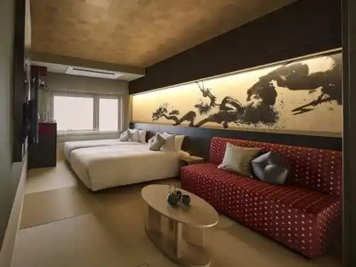 コンセプトルーム 和の趣と洋の快適さを融合した畳敷きの和洋室。ホテル最上階、大浴場と同フロアにあり、湯上りもそのままくつろげます。水墨画家 與座 巧 氏が手掛けた“長寿の象徴”とされる「松」のアートが、心地よい和の雰囲気を演出します。 |