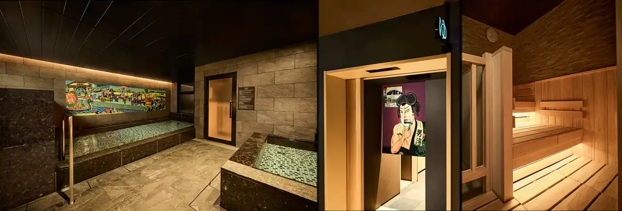 ホテル最上階の大浴場にはサウナルームも完備。鈴木 ひょっとこ 氏による壁面のアートに風情を感じながら、併設する湯上り処とともに旅の疲れを癒すことのできる空間です。 |
