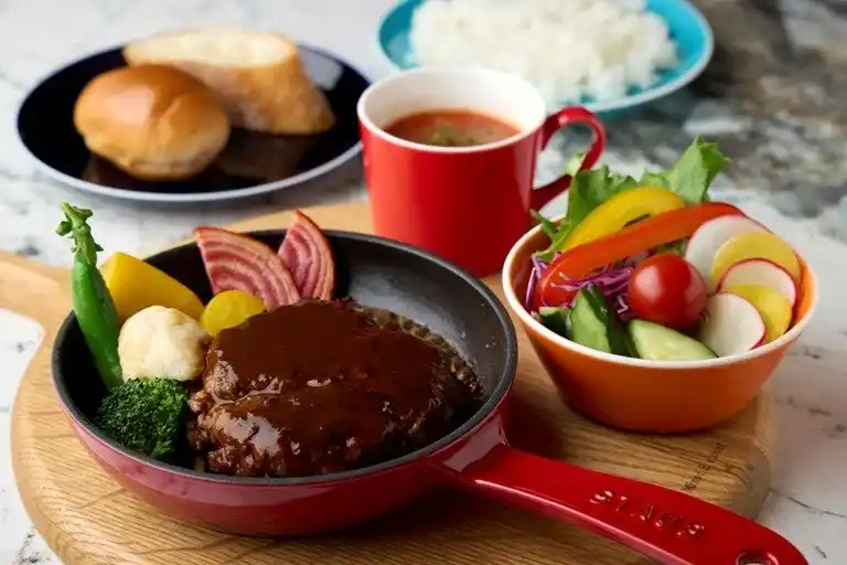 ご注文ごとに一つひとつ丁寧に手ごねし鉄板で焼きあげたハンバーグと、サラダビュッフェなどのセットをお楽しみいただけます。 |