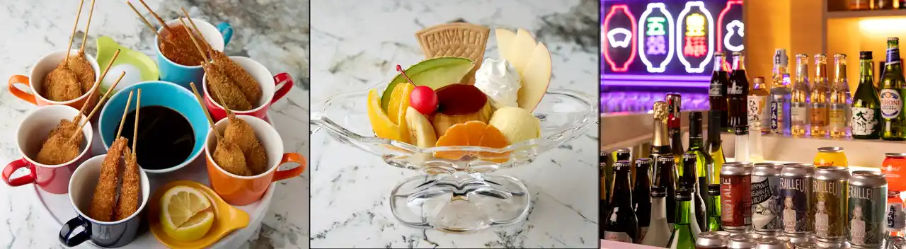夜になると、パブとして表情を変え、はらわた ちゅん子 氏が手掛けるネオン輝く空間で、「串カツ」や、「プリンアラモード」など、ローカルフードをアレンジした料理やスイーツなどが登場。ドリンクは、大阪市西成区のビール醸造所「Derailleur Brew Works(ディレイラ ブリュー ワークス)」の"西成ライオットエール"をはじめ、オリジナルカクテル等、約 50種以上を提供します。 |