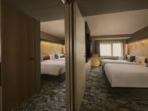ゆったりくつろげる客室は、全室24平米以上で、洗い場付バスルームと独立洗面台、独立トイレを備えます。また、多人数グループでも滞在いただけるよう、一部の客室にはコネクトルーム機能を備え、最大7名様まで宿泊可能です。 |