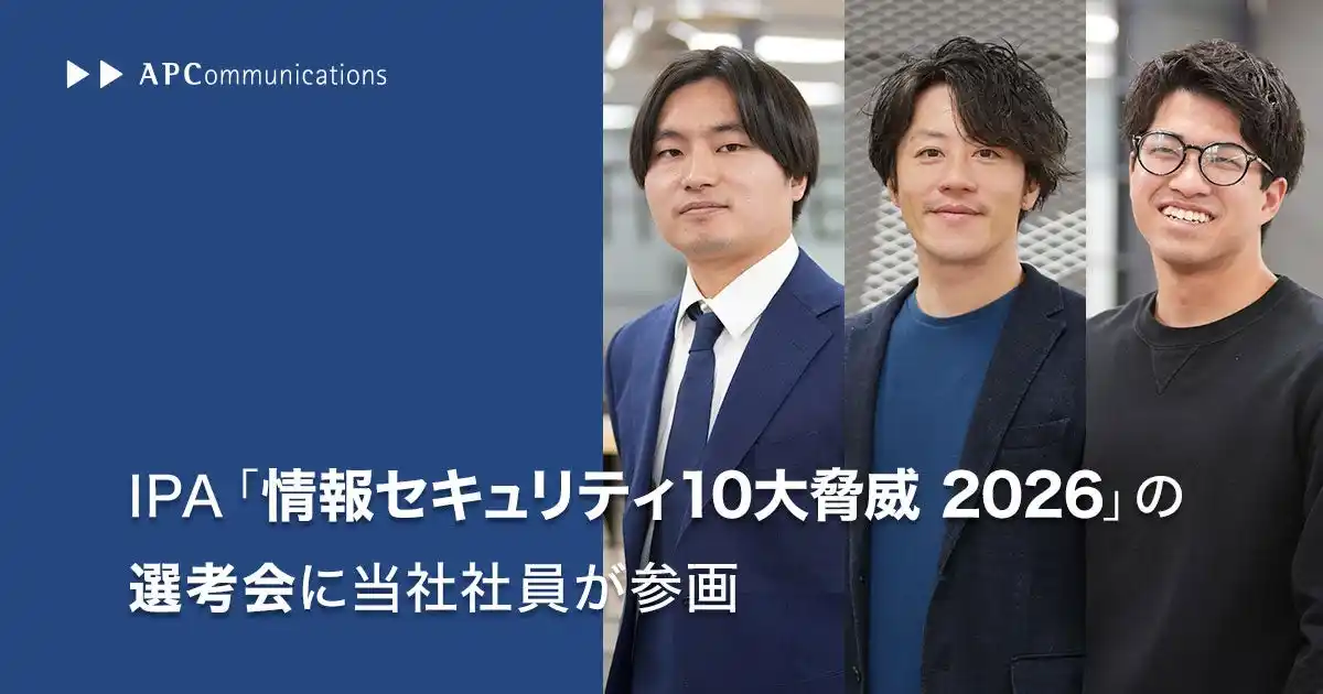 株式会社エーピーコミュニケーションズ(本社:東京都千代田区、代表取締役:内田武志、以下「当社」)は、IPA(独立行政法人情報処理推進機構※)の「情報セキュリティ10大脅威 2026」選考会に、当社のゼロトラスト事業「0-WAN(ゼロワン)」に所属する山根康裕・岸上健吾・柳田大心の3名が参加したことをお知らせします。当社は2023年から4年連続で参加しています。 |