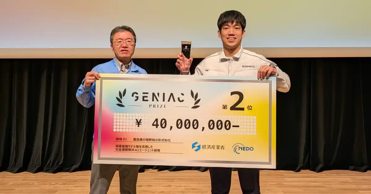 株式会社Algomatic(本社:東京都港区、代表取締役:大野峻典、以下Algomatic)は、三菱重工業株式会社(本社:東京都千代田区、取締役社長CEO:伊藤栄作、以下三菱重工)と共同応募した、経済産業省とNEDOが主催する生成AI分野の研究開発・社会実装の促進を目指したNEDO懸賞金活用型プログラム『GENIAC-PRIZE』のテーマ「製造業の暗黙知の形式知化」において、第2位を受賞したことをお知らせいたします。「TIG溶接技術を例にした熟練者・非熟練者の作業動画の”比較”アプローチによる暗黙知の形式知化」と題し、製造現場において言語化が困難な身体知を構造的に抽出し、形式知として蓄積・活用する取り組みについて提案発表しました。 |