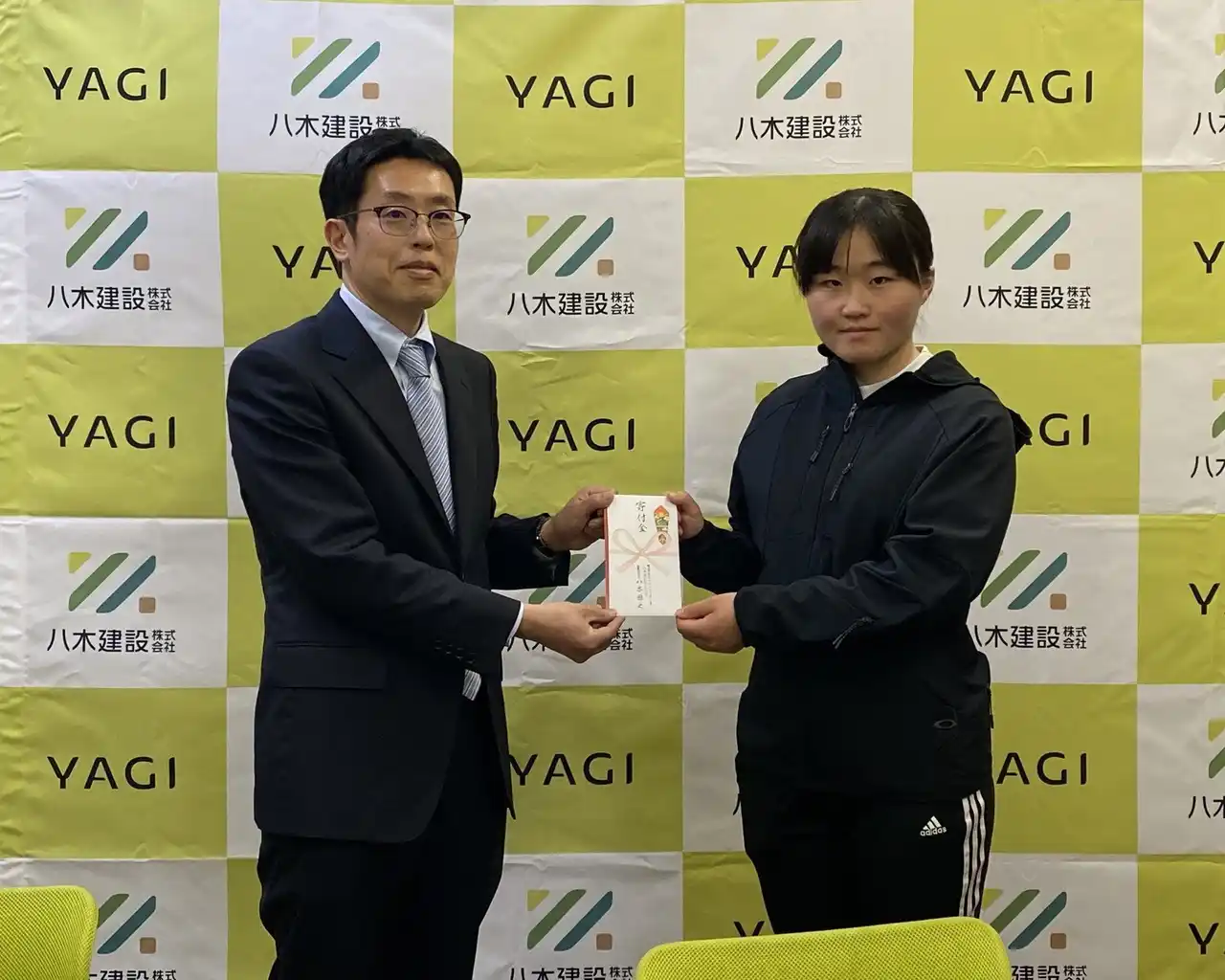 2年目の支援金を手渡す代表八木と澤田選手 |