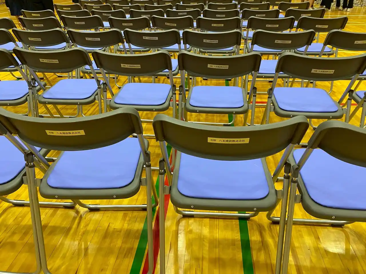 寄贈した330脚の椅子には床保護部材が付いており、式典のたびに重労働となっていた”床シートの設営を不要にする”ものです。 |
