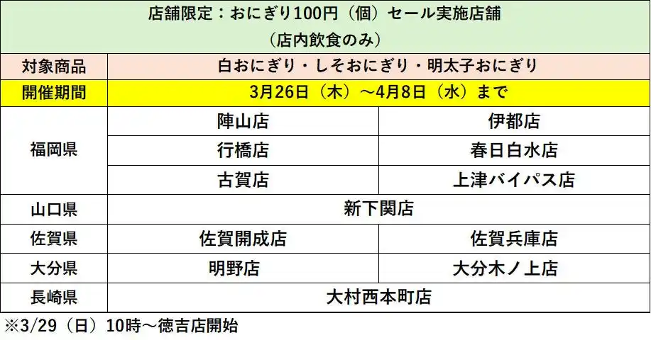 | 対象店舗は下記店舗です。(徳吉店は3/29(日)10時~となります) | |||||||||