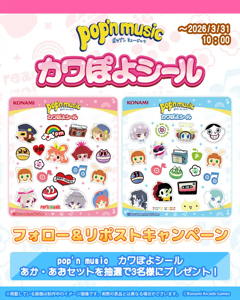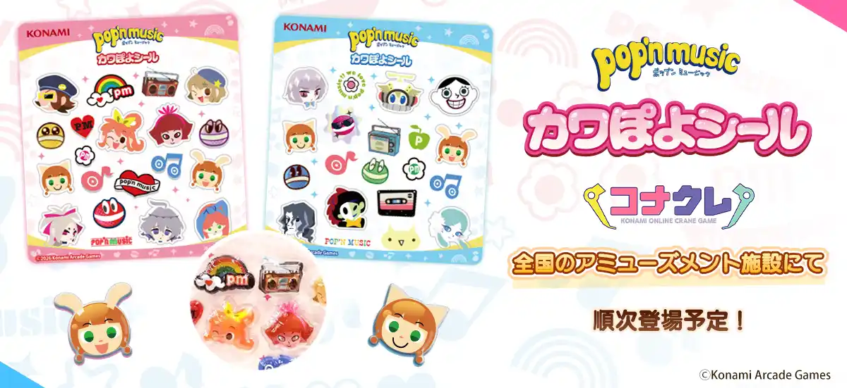 株式会社コナミアーケードゲームスは、アミューズメント景品「pop'n music カワぽよシール」が3月26日(木)から全国のアミューズメント施設に登場することをお知らせします。 |