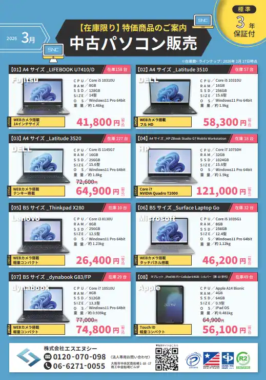 | IT機器のライフサイクル全体をサポートするLCMサービスを展開する株式会社エスエヌシー(本社:大阪府大阪市中央区、代表取締役社長 中近 芳樹、以下「SNC」)が運営する法人様向けの中古パソコンの販売サイト「中古パソコン法人販売」(https://biz.sncj.co.jp/)にて新品パソコンを特価で販売しています。 | ||||||||||||||||