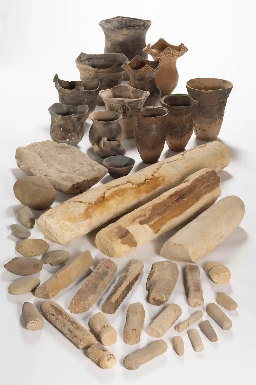 ・石を加工するための敲石や砥石など、製作に使われた工具も多数発見されました。 |