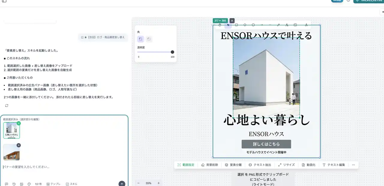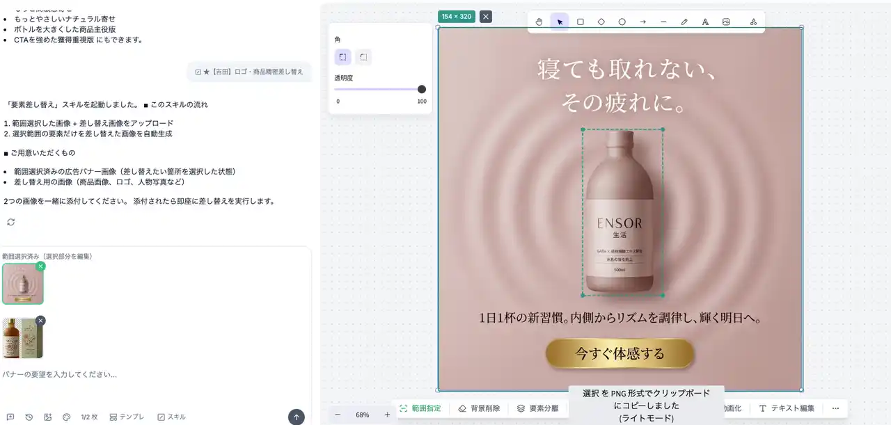 広告バナー内の特定要素(商品画像、ロゴ、人物写真など)を、ユーザーが範囲選択した領域に、別画像で精密に差し替える機能です。差し替え対象以外の背景・構図・ライティングの雰囲気を維持したまま、要素の入れ替えに集中できます。 |
