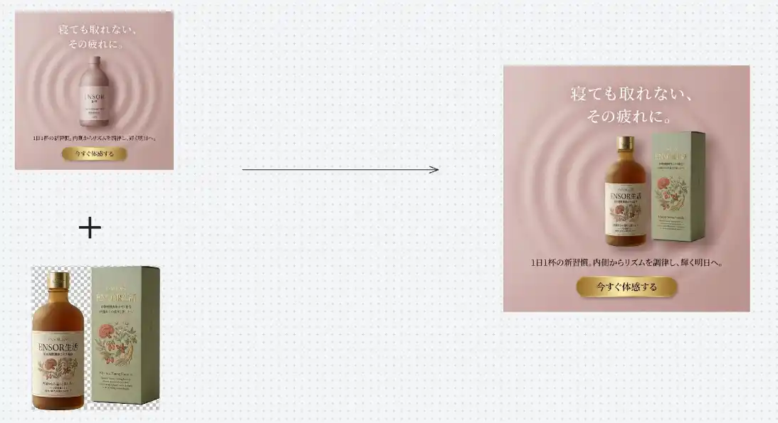ディスプレイ広告では、同一レイアウトのまま商品画像・ロゴ・キービジュアルだけを差し替えて訴求を切り替える場面が多くあります。一方で、画像生成や編集ツールによって全体を作り直すと、背景・構図・光の入り方といった「バナーとしての統一感」が崩れやすく、修正や手戻りが発生しがちです。 |