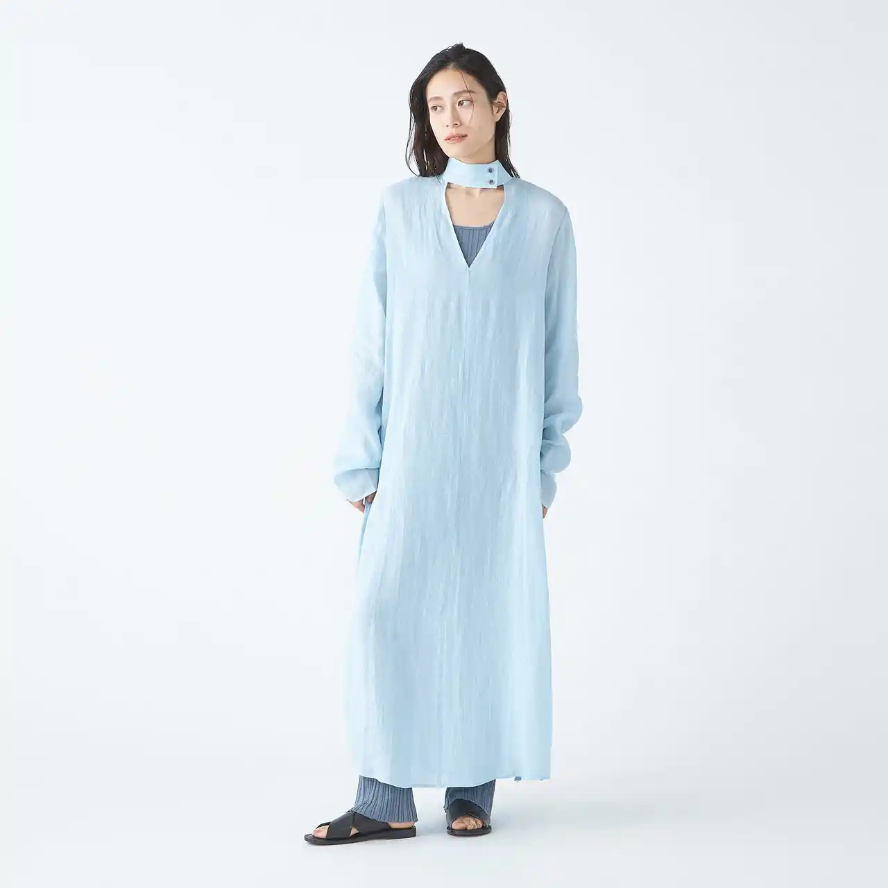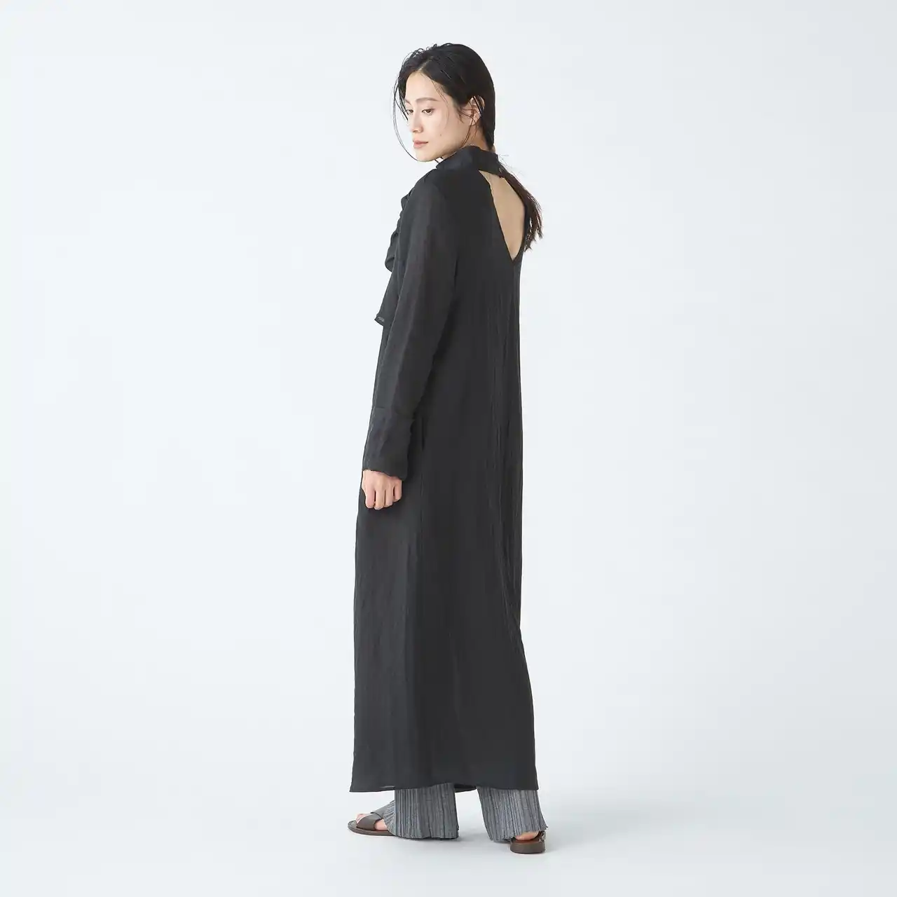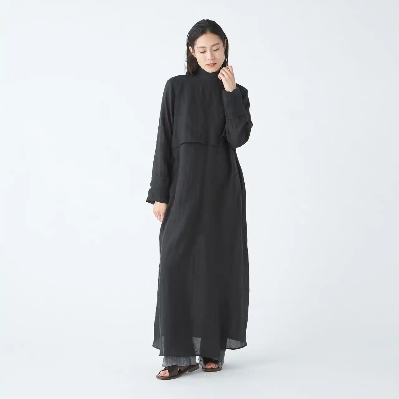 首元のディテールが印象的な、大人のためのワンピーススタイリング。 |