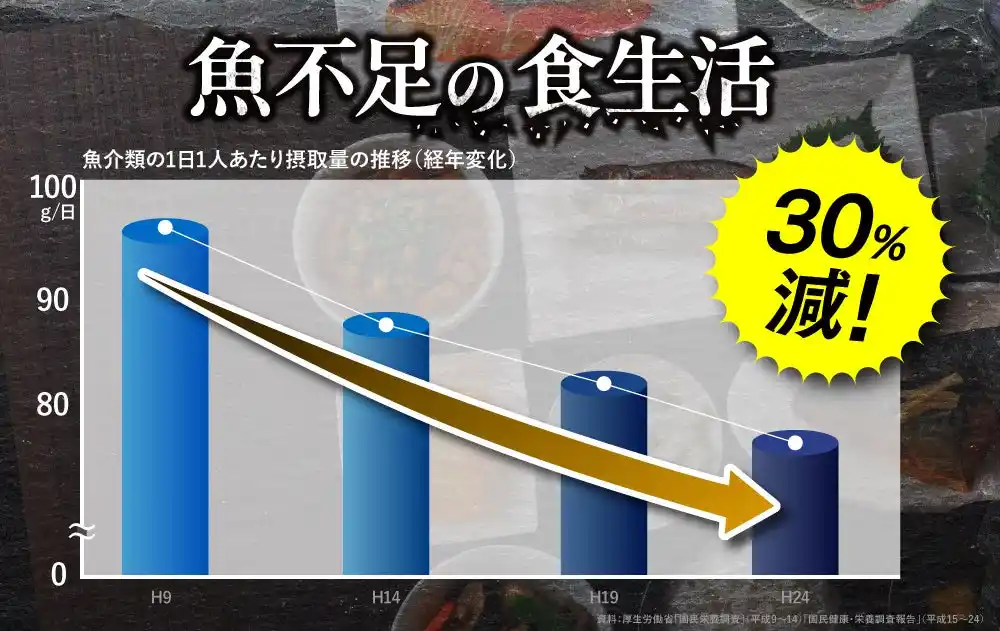 近年、日本では魚の消費量が減少し、魚に含まれる栄養素であるDHA・EPAが不足しがちであるといわれています。そこで、日々の食事だけでは補いにくい栄養を手軽に取り入れられるよう開発されたのが「きなり」です。 |