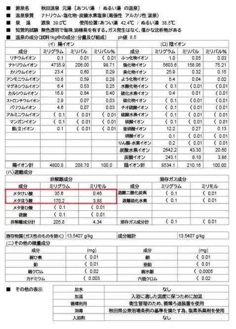 秋田温泉源泉は、pH8.5の弱アルカリ性、“とろみ”のある無色透明のナトリウム・塩化物・炭酸水素塩泉です。美容効果が期待され、メタケイ酸やメタホウ酸も含まれており、肌を健やかに保ちます。 |