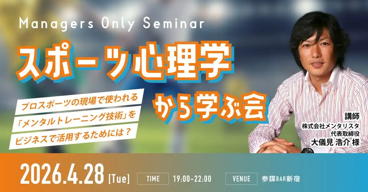 経営者コミュニティ「参謀」を運営する株式会社経営参謀(本社:東京都新宿区、代表取締役:新谷 健司)は、2026年4月28日(火)19時より、新宿・参謀BARにて「スポーツ心理学から学ぶ会~プロスポーツの現場で使われる『メンタルトレーニング技術』をビジネスの現場で活用するためには?~」を開催します。株式会社メンタリスタ代表・大儀見浩介氏を招き、年間250回の現場指導から生まれた実践的メンタルトレーニング術を、経営者がビジネスに即活用できる形でお届けします。参加費は無料、オンライン(Zoom)でも参加いただけます。 |
