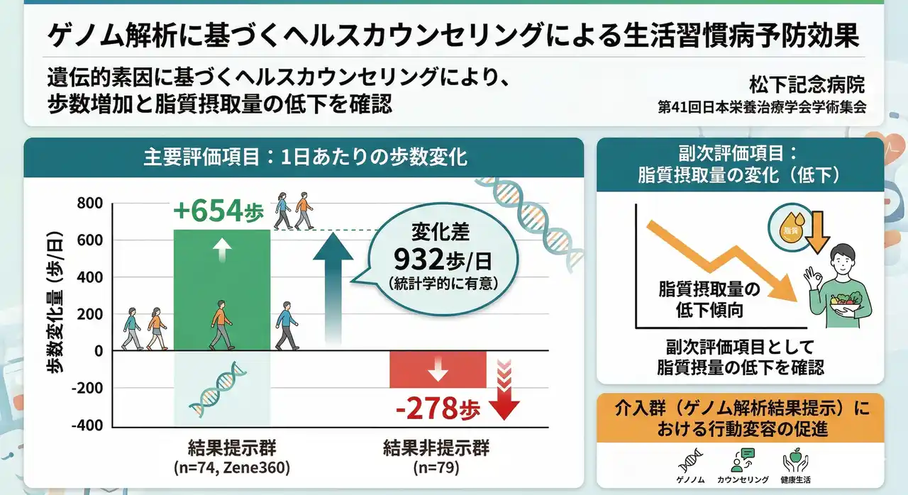 株式会社Zene(以下、Zene)は、第41回日本栄養治療学会学術集会において、松下記念病院 糖尿病・内分泌内科の橋本善隆先生らによる研究発表「ゲノム解析結果が生活習慣病予防に向けた行動変容に与える影響 ―探索的ランダム化比較試験―」において、Zeneのゲノム解析サービス「Zene360」を活用した研究成果が報告されたことをお知らせします。 |