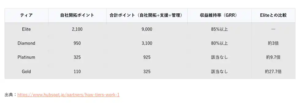 上表の通り、Eliteの合計ポイント閾値は9,000ポイントであり、Diamond(3,100ポイント)の約3倍。自社開拓ポイントもElite 2,100に対しDiamond 950と約2.2倍の開きがあります。さらに、Eliteには収益維持率(GRR)85%以上、チーム全体で100件以上の認定資格、およびHubSpotからの招待(審査)という追加要件が課されます。 |