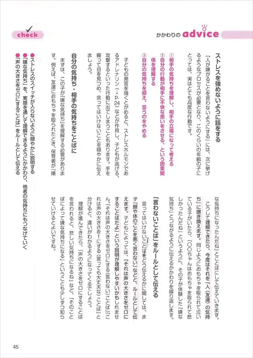 さらに、愛情や信頼の形成に関わるオキシトシン、興奮やストレス反応に関わるアドレナリンなど、近年注目されている心身に影響するホルモンや神経伝達物質にも注目。子どもの心身や行動にどう影響するのか、生理学的な側面から解説しています。 |