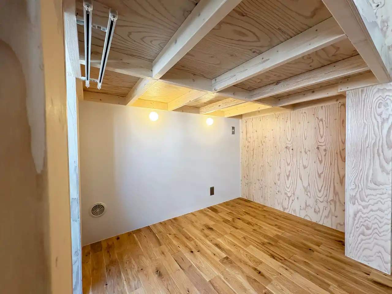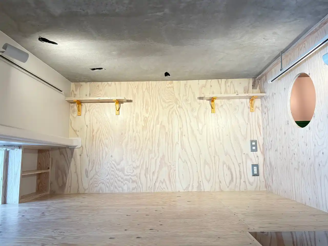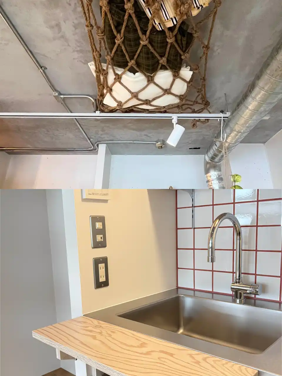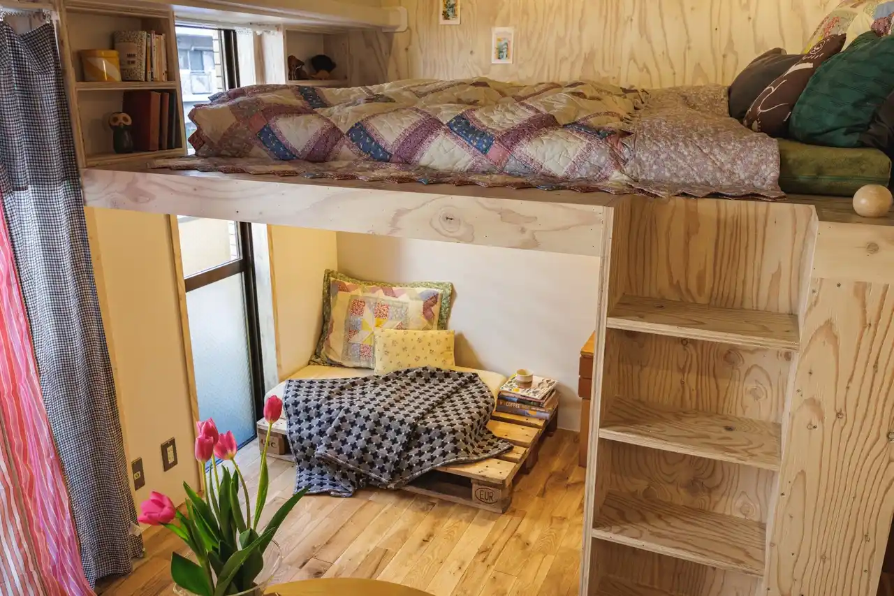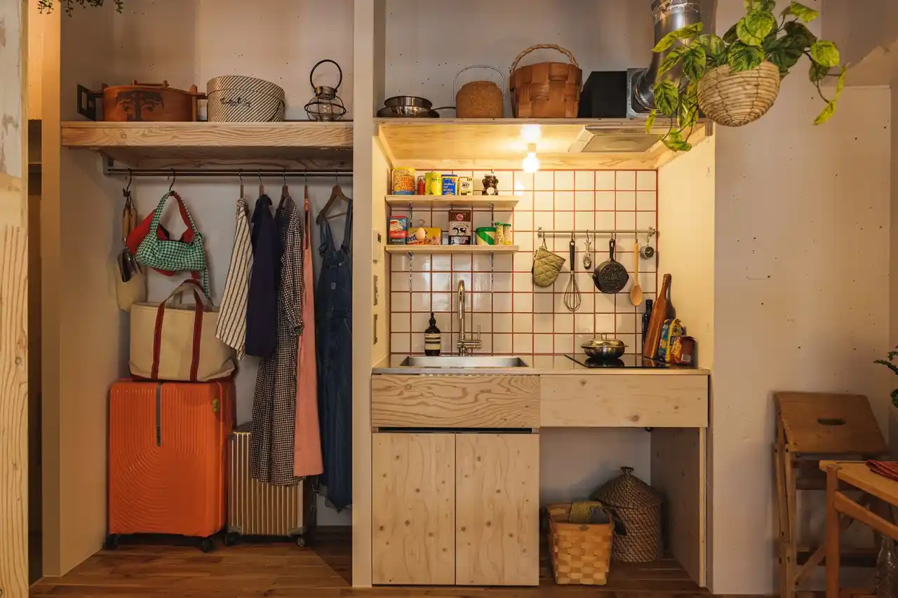 ロフト空間へはハシゴではなく収納棚に見える階段を造作。遊び心のある作りにし、同素材で統一感を演出しました。キッチンには拡張作業台がついており、必要なときに広げられるようになっています。天井にはネット収納を取り付け、空間全体が収納スペースとして使えるように。今回の裏テーマ「スペースマスター」の通り、限られた空間を最大限に活かせるお部屋となりました。 |