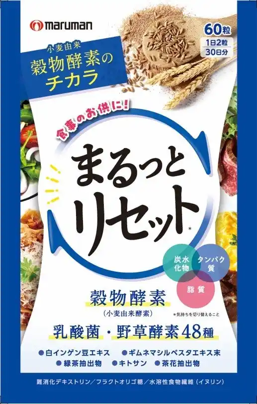 「まるっとリセット」は食習慣が気になる方に向けて開発された小麦由来酵素を使用した新しいタイプの酵素商品。現時点でこの素材を活用した商品は市場にほとんど存在しておらず、独自性が高いことが最大の特徴です。分解対象が限定的である商品が多い中、本商品は穀物酵素×乳酸菌×野草酵素48種を掛け合わせることにより、炭水化物・タンパク質・脂質の三大栄養素すべてに対応し、消化・吸収の促進および代謝の活性化に寄与します。 |
