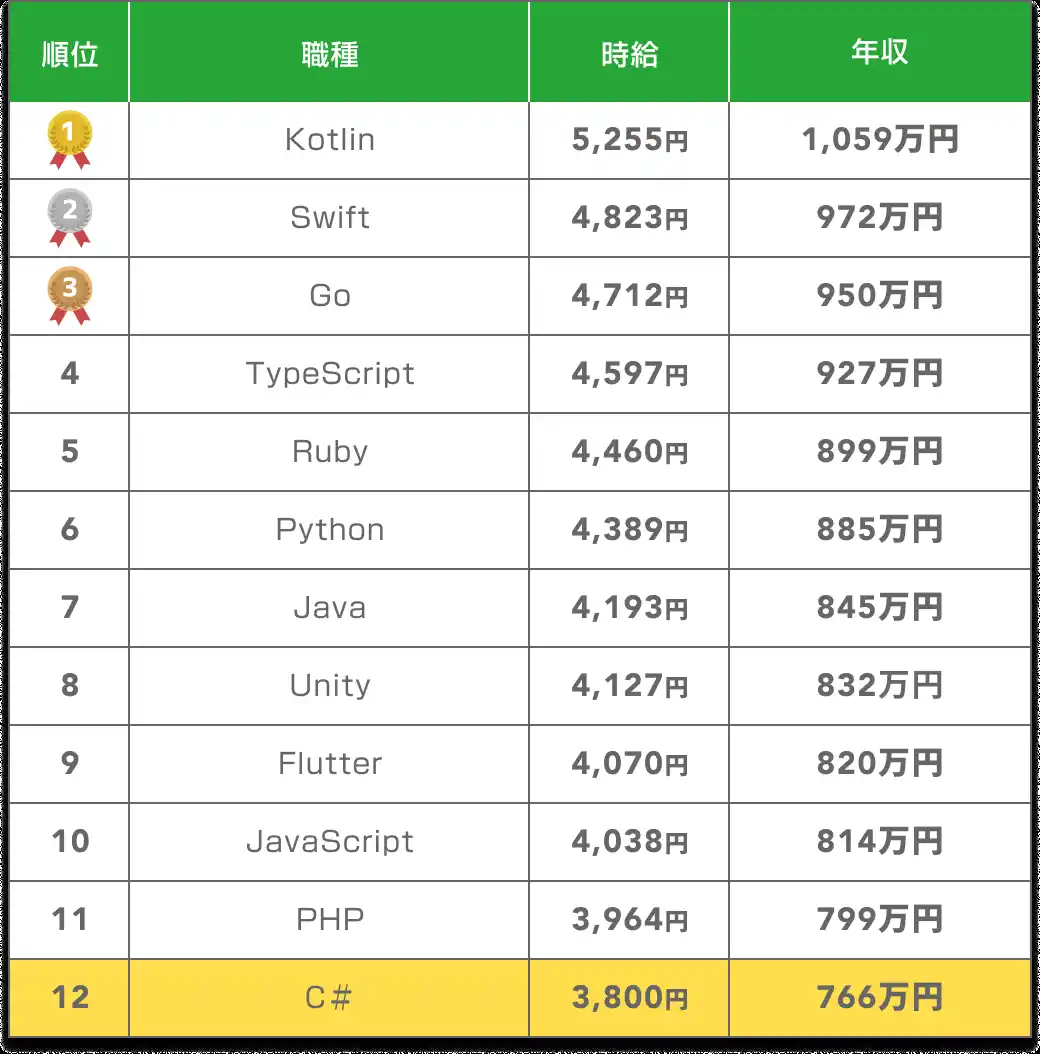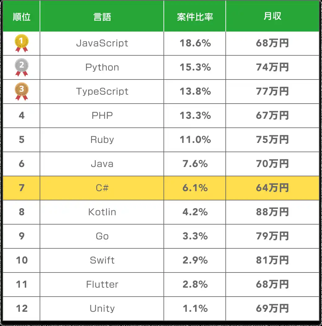 | 一方で、競合が少ない分、C#の実務経験があれば案件獲得の難易度は高くありません。Unityを使ったゲーム開発や、.NET MAUIによるクロスプラットフォーム開発など、活躍領域を広げることで選択肢を増やすことも可能です。 | |||||
