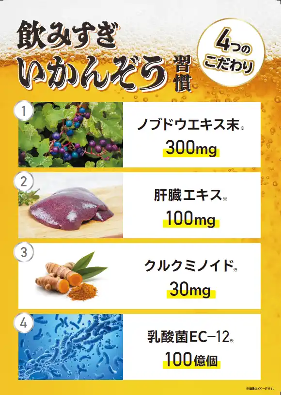 「飲みすぎいかんぞう習慣」は、飲酒の機会が増えた人々をサポートするために開発された、日々の生活を健康的に支える新習慣サプリメントです。体感性の高いこだわりの原料を配合することで、消費者のお悩みにしっかり寄り添います。 |