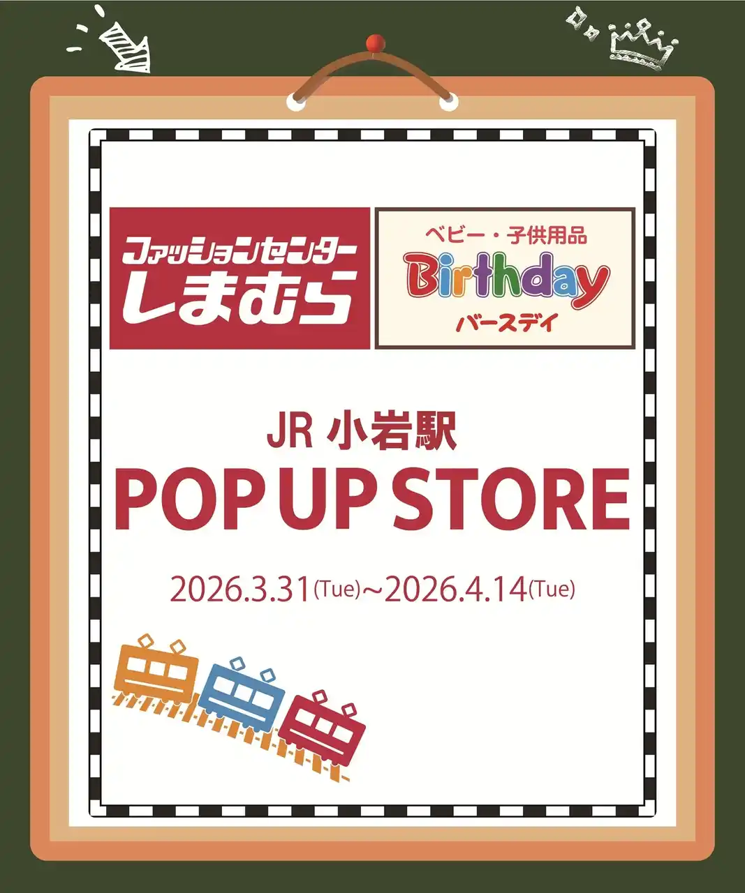 株式会社しまむら(本社所在地:埼玉県さいたま市大宮区北袋町1-602-1、代表取締役:高橋 維一郎)は、 3月31日(火)より、JR小岩駅にて、ファッションセンターしまむら・ベビー・子供用品バースデイによる期間限定POP UP STOREを出店いたします。子供服を中心に企画を多数ご用意し、皆様のご来店を心よりお待ちしております。 |