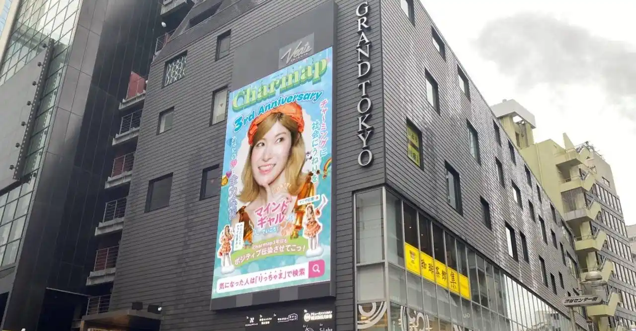 「起業家と企業の推し活」を軸に展示会・イベント支援を行うCharmap株式会社(チャマップ、本社:東京都渋谷区、代表:三田理紗子)は、会社設立2周年を記念し、渋谷のセンター街付近にて、チャマップ代表の三田(りっちゃま)が登場する屋外広告を掲載します。掲載期間は2026年3月27日(金)~31日(火)の5日間です。 |