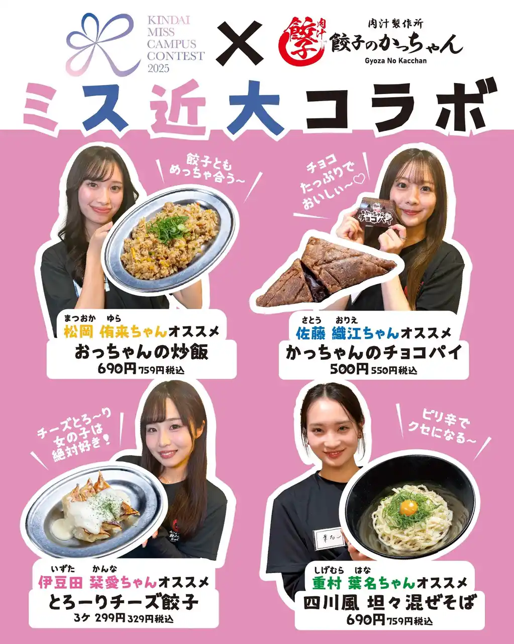 推しが選んだ一皿を食べるもよし、全部制覇するもよし! 「餃子のかっちゃん」で、ミス近大オススメの味を楽しんでみませんか?ガッツリ系からSNS映えスイーツまで、彼女たちが「本当に食べてほしい!」と太鼓判を押すラインナップはこちら! |
