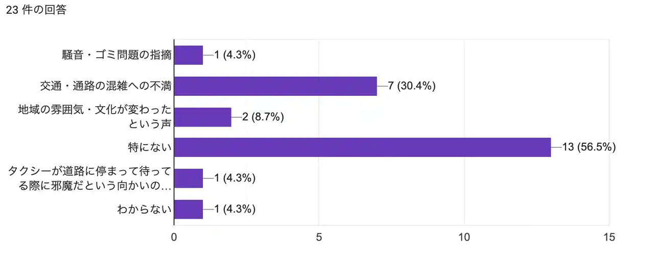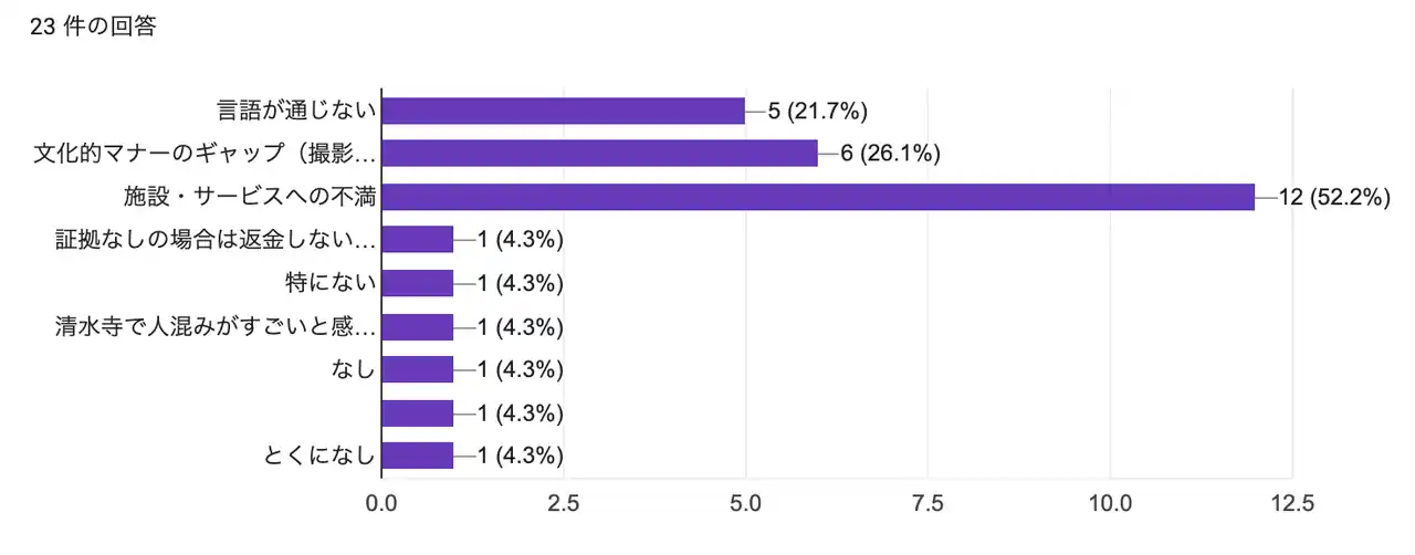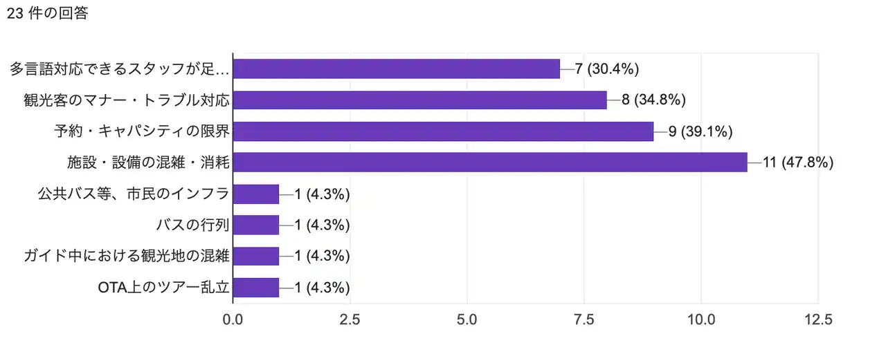 文化的マナーのギャップや言語の壁も一定数見られ、オーバーツーリズムが単なる混雑問題にとどまらず、サービス品質や顧客体験にも影響を及ぼしていることがわかります。 |