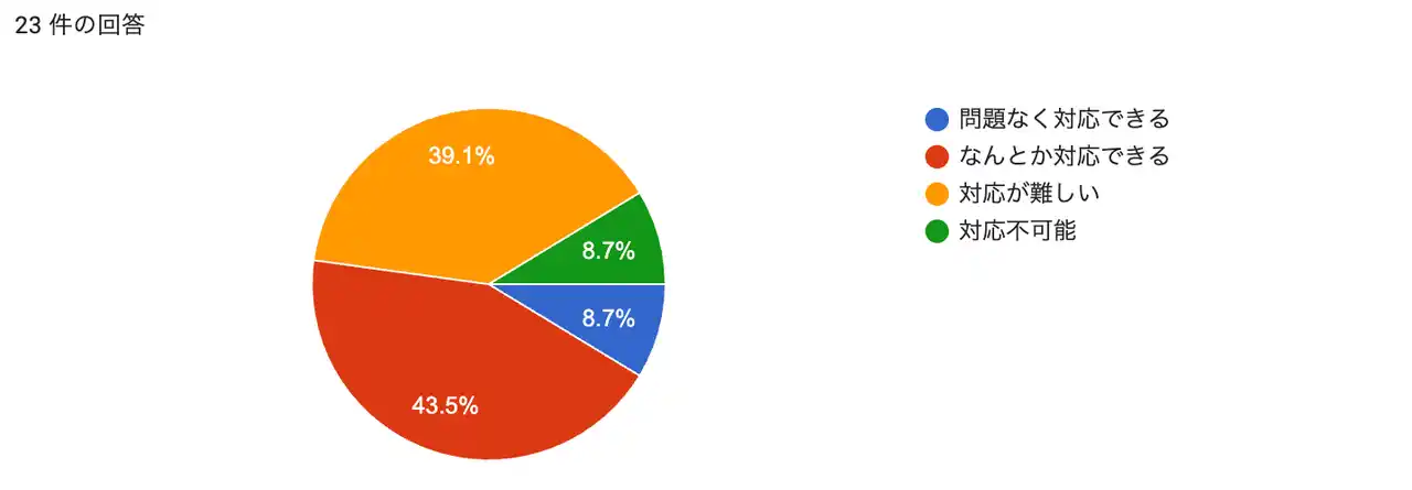 43.5%が「なんとか対応できる」と回答した一方で、「対応が難しい」「対応不可能」との回答は約48%と半数近くにのぼります。 |