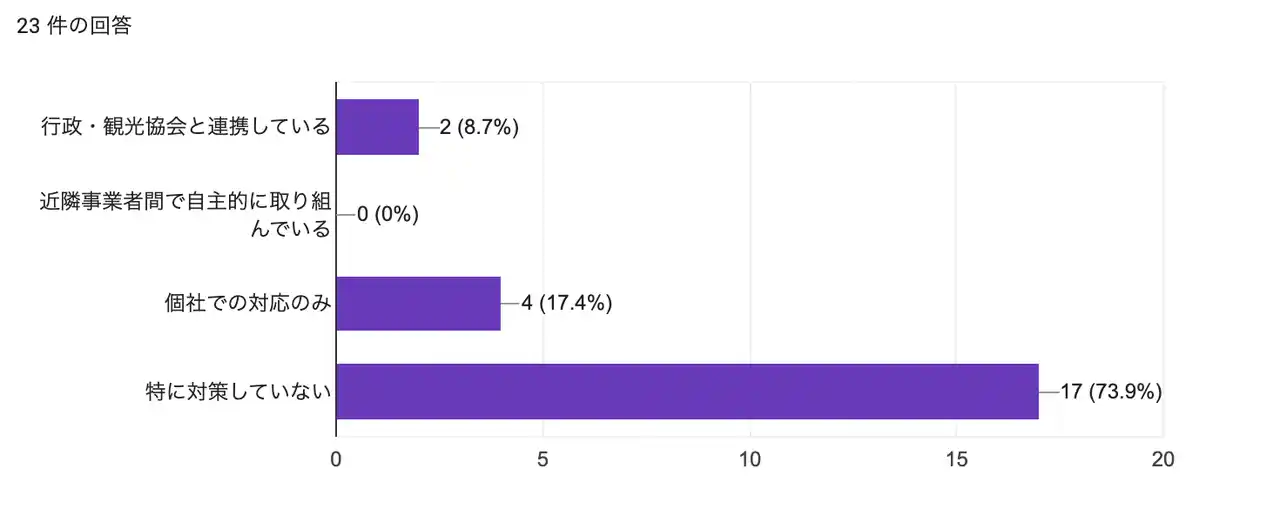 オーバーツーリズムを実感しながらも、組織的・地域連携による対策が進んでいない実態が明らかになりました。個社対応にとどまる現状は、今後の課題として業界全体で共有すべき問題です。 |