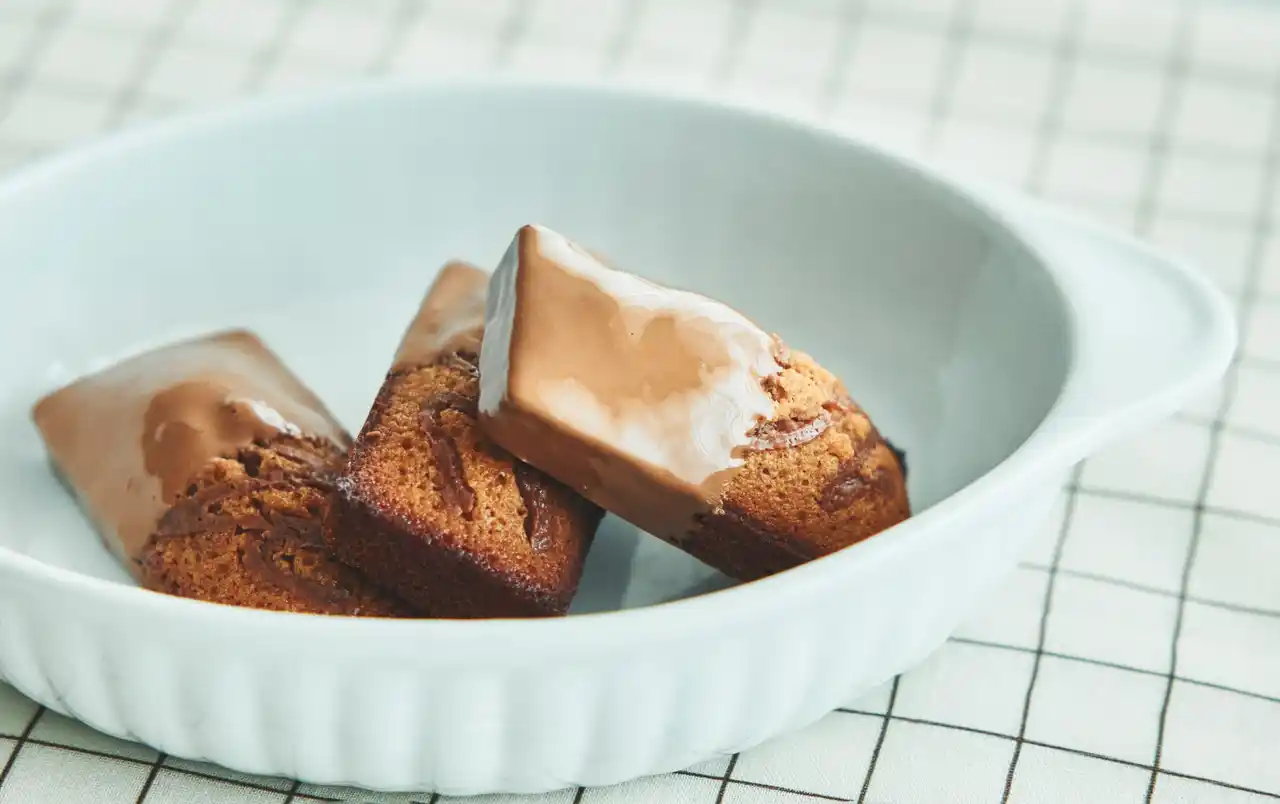 Murirのミルクチョコレートのおいしさを閉じ込めたショコラフィナンシェ。ヘーゼルナッツの香ばしさとミルクチョコレートを合わせたフィナンシェ生地に、ガナッシュをしぼって焼き上げ、さらにミルクチョコレートを半分だけかけて仕上げました。生地、ガナッシュ、コーティングチョコレート、全てにMurirのミルクチョコレートを使用した、Murirのおいしさを堪能できるフィナンシェです。 |